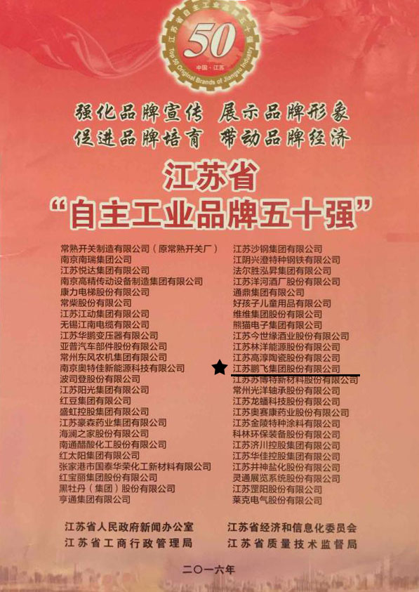鵬飛集團(tuán)入選2015年度“江蘇自主工業(yè)品牌50強(qiáng)”企業(yè)