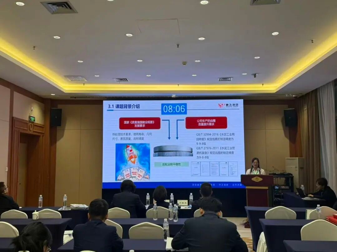 鵬飛金工QC小組發(fā)表成果《提高陽極爐齒圈和滾圈傳動連體一次加工合格率》。金工大齒輪組圍繞陽極爐齒圈和滾圈轉(zhuǎn)動連體加工中的變形和精度等問題,展開此次QC小組活動。小組利用創(chuàng)新工法的制定與實施,不僅提升了一次加工合格率18.2%,縮短了加工周期,還保障了產(chǎn)品的穩(wěn)定性,節(jié)約了成本。