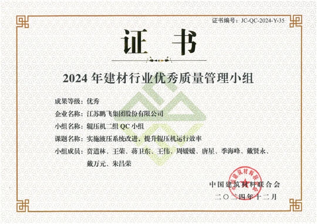 會議為2024年建材行業(yè)質(zhì)量管理活動優(yōu)秀質(zhì)量管理成果、先進個人和優(yōu)秀組織,2024年建材行業(yè)質(zhì)量管理活動“我最喜愛的質(zhì)量管理小組”和“我最喜愛的質(zhì)量信得過班組”,以及2024年度建材行業(yè)“三品”典型案例的獲得者頒發(fā)證書。鵬飛多項成果榮獲佳績。
