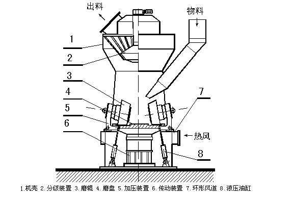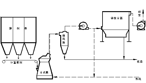2.氣體流程:熱風→立式磨→旋風收塵器→1號排風機→袋收塵器→2號排風機→排空。 循環風(余熱利用)