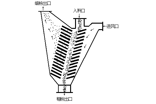 粉磨后的礦渣,由上部物料入口喂入選粉機,經下料溜管落到撒料盤上;傳動裝置驅動主軸回轉,固定在主軸上的撒料盤和籠型轉子隨之旋轉,撒料盤上的礦渣粉被加速均勻地撒開;與此同時,上渦殼進入的氣流,在導向葉片的作用下,旋轉吹向撒料盤,加速物料分散的力度,和下落料幕的均勻性;隨之也提高了選粉機對礦渣粉的處理能力;下落料幕在下渦殼進入旋轉氣流的作用下,減緩了下落速度,延長了懸浮分散的時間;在籠型轉子回轉產生的平面渦流的作用下,逐步分級,粗顆粒由于自重或被轉子擊落,沉降到下錐體內,從底部粗粉出口排出,返回磨機重新粉磨;細顆粒隨氣流通過籠型轉子邊緣,進入中心部位,被出風管的負壓抽力帶入細粉收集系統過濾、分離、而收集下來。