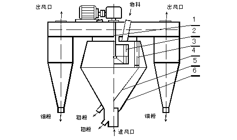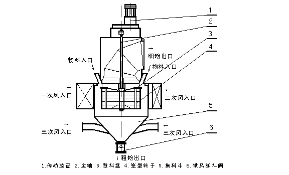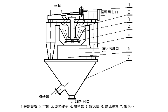 由傳動裝置、回轉部分(主軸、撒料盤、轉子等),機殼(內筒、導向葉片、內錐體、外筒、外錐體、進風口、加料口、兩個粗粉出口等),細粉收集裝置(四個旋風筒等)組成。