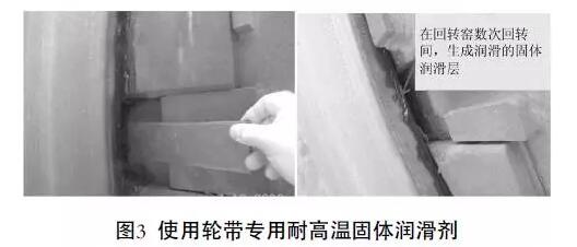 為減輕輪帶內(nèi)表面與墊板的磨損,我在輪帶內(nèi)表面增加輪帶專用耐高溫固體潤(rùn)滑劑,這種潤(rùn)滑劑借助筒體表面的熱度,將熔化的固體潤(rùn)滑成分留在滑動(dòng)面上,見(jiàn)圖3.