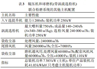 此系統(tǒng)主要由V 型選粉機(jī)、輥壓機(jī)、球磨機(jī)和渦流選粉機(jī)組成,球磨機(jī)系統(tǒng)為閉路系統(tǒng),流程見圖4。該系統(tǒng)的V 型選粉機(jī)、輥壓機(jī)、水泥磨和出磨提升機(jī)的配置及其性能完全同表 2,其他主機(jī)配置見表3。