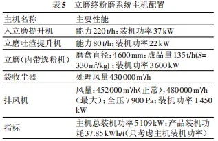 此系統(tǒng)主要由 V 型選粉機(jī)、輥壓機(jī)、旋風(fēng)收塵器、球磨機(jī)和組合式選粉機(jī)組成,球磨機(jī)系統(tǒng)為閉路系統(tǒng),流程圖見圖 3,主要的主機(jī)配置見表 2。其中輥壓機(jī)系統(tǒng)設(shè)有單獨(dú)放風(fēng)系統(tǒng),球磨機(jī)單獨(dú)通風(fēng)與組合式選粉機(jī)放風(fēng)共用一套收塵系統(tǒng)。