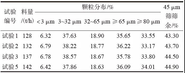 關(guān)閉和開啟不同格數(shù)的分料閥進行生產(chǎn),分別標定磨機產(chǎn)量,并對粉磨過程中各點物料進行取樣,測定物料顆粒組成及物理性能、與外加劑相容性。然后對加工過程中各點物料粒度變化情況進行比較后進行質(zhì)量指標的調(diào)整(試驗5)。