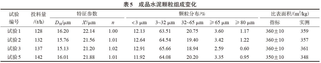 由表7可知,基準試驗1中選粉效率較低,說明磨機存在過粉磨情況。部分V型選粉機微粉直接進入高效選粉機,相對于基準試驗1,試驗2、試驗3和試驗5提供給選粉機的物料中合格細粉量增加,降低了回磨的循環(huán)料量,經(jīng)過高效選粉機分選后,成品率提高,磨內(nèi)通過料量相應(yīng)減少,降低了循環(huán)負荷率,減緩了對研磨體的襯墊作用,避免了過粉磨現(xiàn)象,使粉磨系統(tǒng)產(chǎn)量提高。