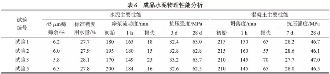 成品水泥顆粒組成變化分析見表5,成品水泥物理性能變化見表6。其中,(1)水泥凈漿流動度和混凝土坍落度試驗中減水劑均使用JY公司生產(chǎn)的PS-1型聚羧酸減水劑;(2)水泥凈漿流動度試驗依照GB/T 8077—2012《混凝土外加劑勻質(zhì)性試驗方法》進行,減水劑摻入量為水泥質(zhì)量的0.8%;(3)混凝土強度等級為C30,依照JGJ 55—2011《普通混凝土配合比設(shè)計規(guī)程》進行的相同配合比設(shè)計,減水劑摻入量為膠凝材料質(zhì)量(水泥、粉煤灰和礦粉)的2.0%,膠凝材料和骨料均為同一進廠批次,坍落度試驗依照GB/T 50080—2016《普通混凝土拌合物性能試驗方法標準》進行。