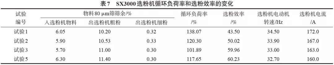 SX3000型選粉機系統(tǒng)循環(huán)負荷率和選粉效率對比見表7。