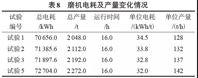 5 效益分析試驗過程中粉磨系統(tǒng)的電耗及產(chǎn)量變化見表8。