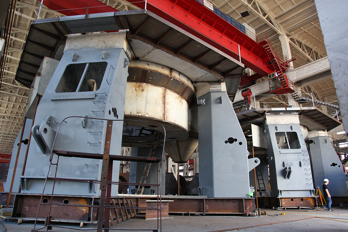 磨煤機(jī)三個(gè)磨輥由旋轉(zhuǎn)的磨盤帶動(dòng)進(jìn)行碾磨作業(yè)。入磨物料經(jīng)中心落煤管落在磨盤上后,由旋轉(zhuǎn)磨盤產(chǎn)生的離心力將其輸送至碾磨輥道上碾磨。碾磨壓力由彈簧或液壓加壓裝置產(chǎn)生,通過靜定的三點(diǎn)系統(tǒng),碾磨力均勻地傳至三個(gè)磨輥,通過加壓系統(tǒng)壓力傳至基礎(chǔ)。煤粉的干燥和輸送利用熱風(fēng)來進(jìn)行。熱風(fēng)通過噴嘴環(huán)均勻分布于磨盤四周,將經(jīng)碾磨的物料干燥并輸送至磨機(jī)上部的分離器。物料的粗細(xì)粉在此分離,細(xì)粉排出磨機(jī),粗粉重新返回磨內(nèi)碾磨。物料中的一些不可破碎物可通過磨機(jī)下部的排碴口排出。磨煤機(jī)主要由基礎(chǔ)部,減速機(jī),下架機(jī),中架機(jī),磨盤,磨輥,加壓裝置,分離器,正壓風(fēng)密封裝置,蒸汽吹掃裝置等部件組成,還配有主電動(dòng)機(jī),潤(rùn)滑油站,液壓站和密封風(fēng)機(jī)等附屬設(shè)備,另備有慢速傳動(dòng)裝置,安裝檢修專用工具,扶梯平臺(tái),煤粉分配器,速斷閥等配套設(shè)備供用戶選用。磨煤機(jī)采用液壓加壓系統(tǒng),在運(yùn)行中即可對(duì)粉磨壓力進(jìn)行調(diào)整,并具有更好的過鐵保護(hù)性能。在原標(biāo)準(zhǔn)型的基礎(chǔ)上增加了磨輥翻出裝置,并提高了磨體的抗爆能力。