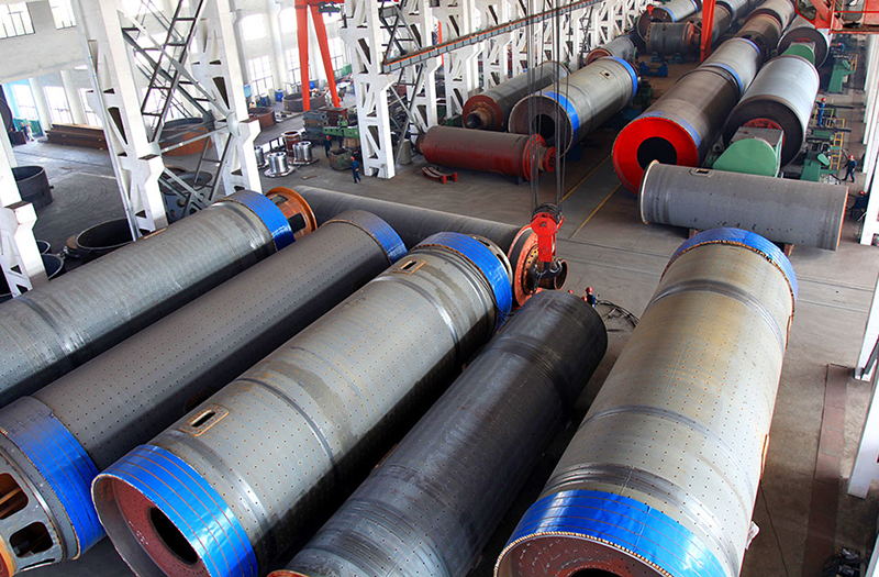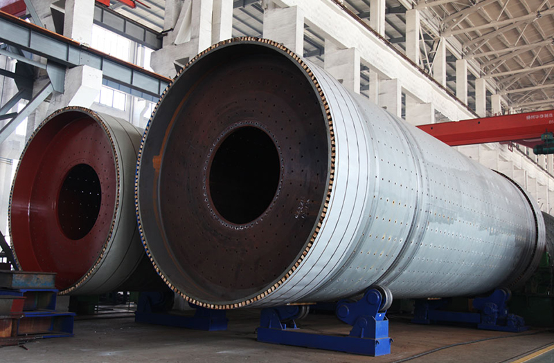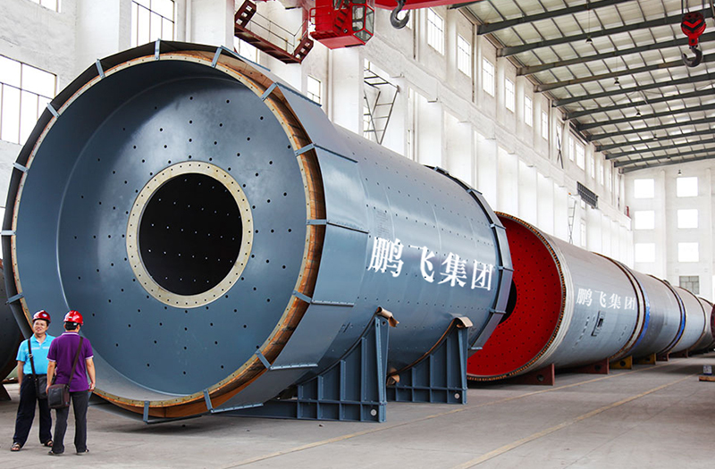 本機為筒形旋轉裝置,外沿齒輪傳動,兩倉,格子型球磨機。物料由進料裝置經入料中空軸螺旋均勻地進入磨機第一倉,該倉內有階梯襯板或波紋襯板,內裝不同規格鋼球,筒體轉動產生離心力將鋼球帶到一定高度后落下,對物料產生重擊和研磨作用。物料在第一倉達到粗磨后,經單層隔倉板進入第二倉,該倉內鑲有平襯板,內有鋼球,將物料進一步研磨。粉狀物通過卸料箅板排出,完成粉磨作業。